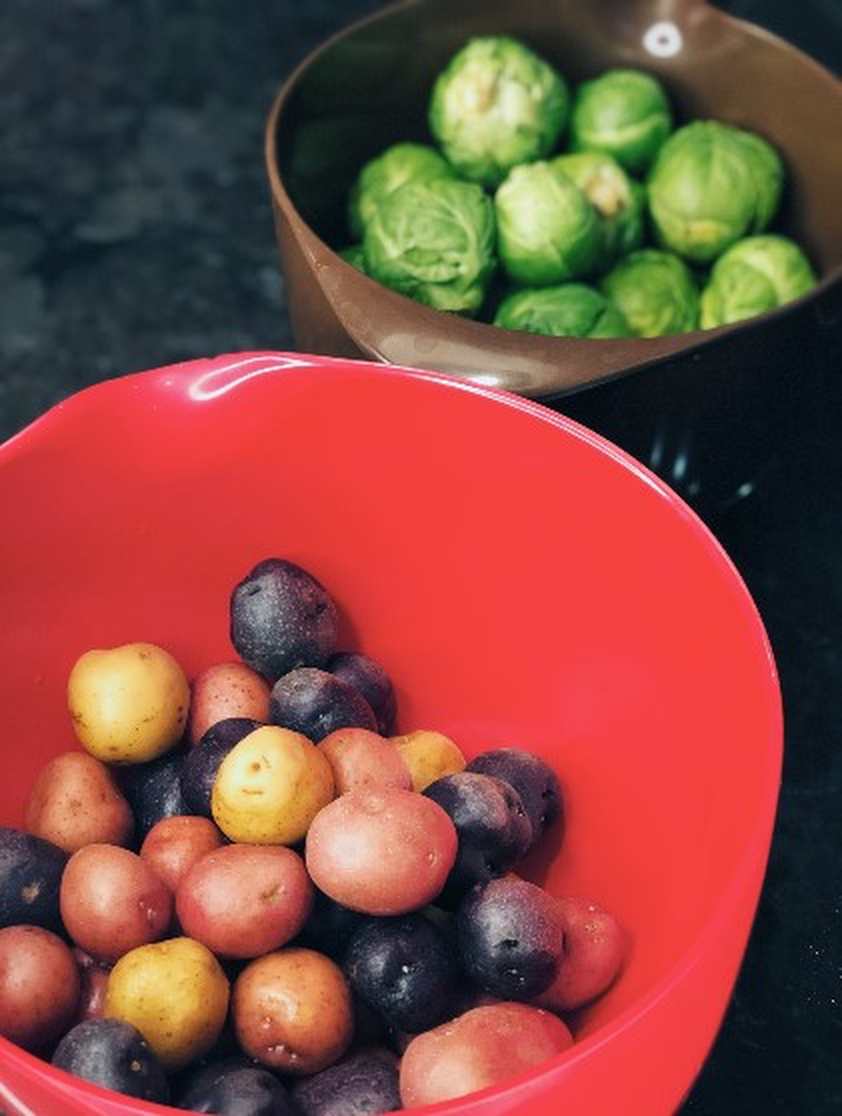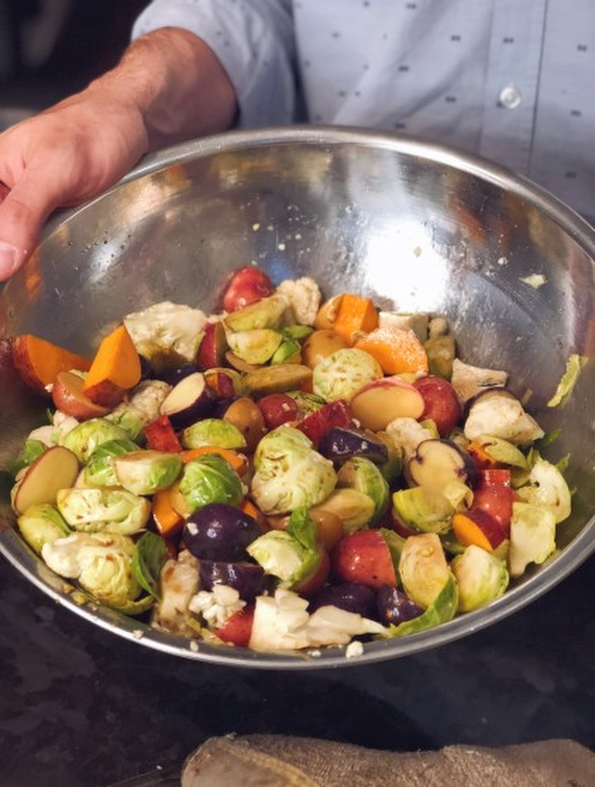Peel sweet potato and cut into one inch squares. Half the little potatoes and the brussel sprouts. Cut cauliflower into small pieces. Toss everything with olive oil, balsamic vinegar, lemon juice, minced garlic, salt and pepper. Place on a sheet pan covered in tin foil.