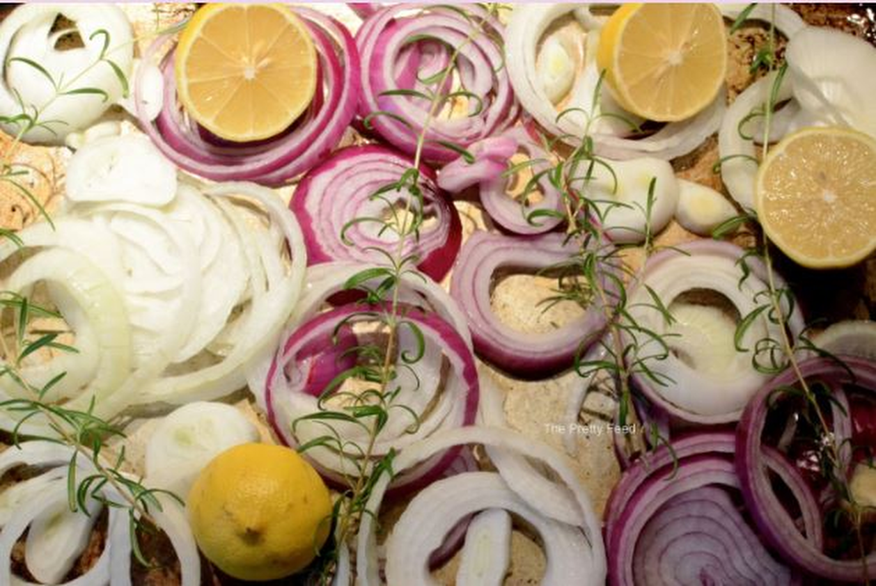 Slice the onions into rings and quarter one of the lemons and slice the other two into medium slices. Oil a sheet pan with the olive oil. Place rings of onions on the sheet pan along with sprigs of rosemary.