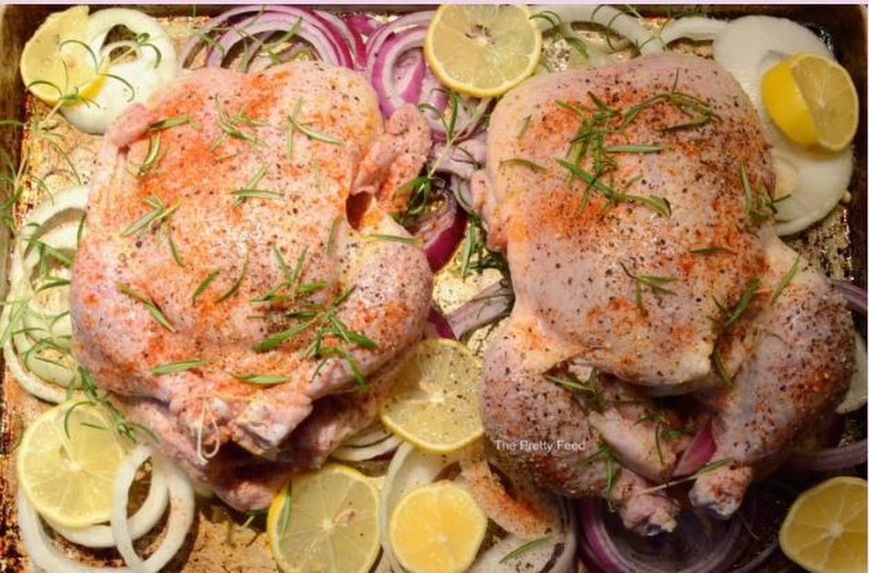 In the cavity of the chickens place 2 quarters of the lemons. Rub olive oil all over the chicken. Generously salt and pepper the chickens and sprinkle with cayenne pepper (remember to do the sides of the chickens). Place the chickens on top of the onions.