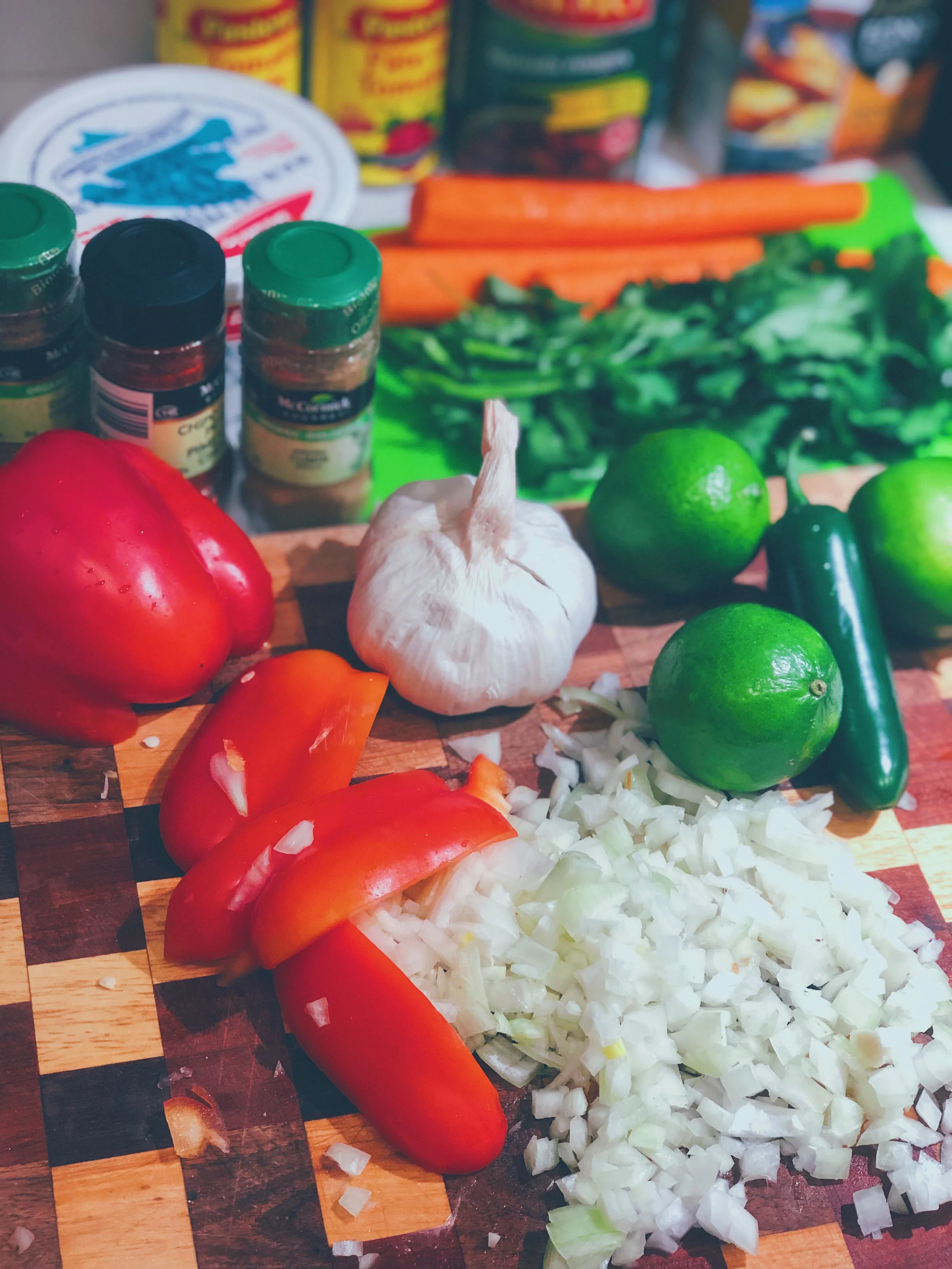 2 tsp of each spice: cumin, coriander, chili, cayenne, chipotle chili, salt, pepper, thyme (or to taste)